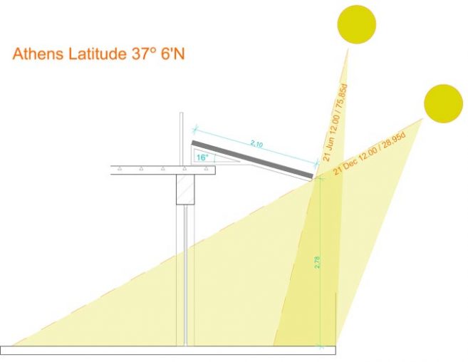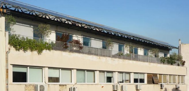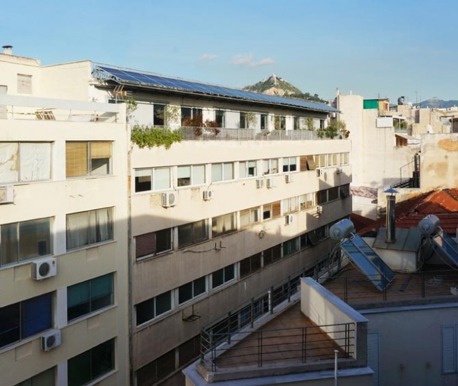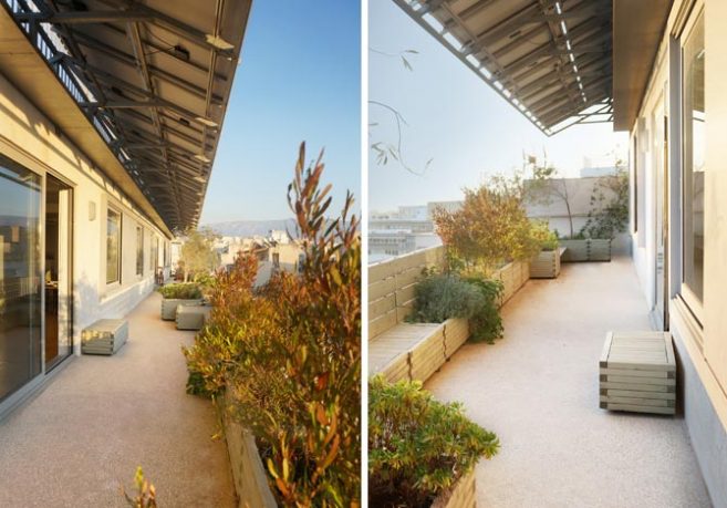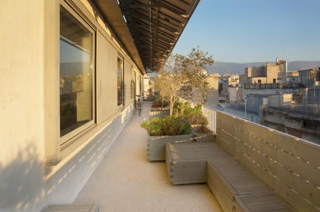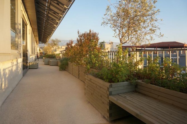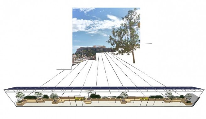 The project is situated on the top floor of a typical warehouse in the center of Athens, offering an extensive view towards the Acropolis Hill to an office space. The intention was to reinforce the idea of the balcony as a transitional space, considering the office’s needs for a green space and a communal area, the urban context and environmental issues. Natural shadow, exploitation of solar energy and planting were the major principles for designing a sustainable outdoor urban space. Plants, wooden constructions and the view were the three basic tools which formed the final design. Therefore, a linear system of solar panels was constructed as a shed, protecting from the weather as a passive solar element but at the same time utilising the solar energy. In order to preserve the unobstructed view from the interior space to the Acropolis Hill, all the olive trees were placed between the windows. Bushes were planted in front of the windows, creating a composition between the view and the Mediterranean plants. There are two types of sitting areas, the directly accessible ones that are designed close to the passages and the more isolated ones. Herbs are located next to the seats in order to enhance the sent of the environment. The plant pots and the sitting areas are made of the same material –wood-, creating a common theme throughout the whole composition. Plants typical of this environment were selected based on their ability to withstand the weather conditions at this height.