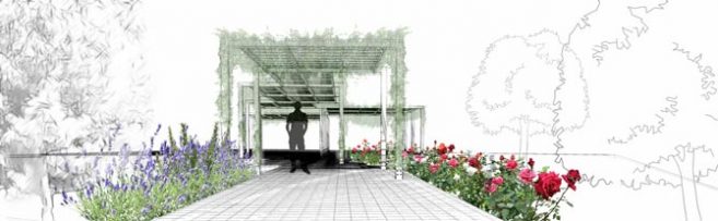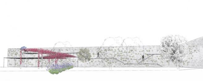 Parallel to the preexisting wall fences surrounding the property, a green screen, in a small distance from the fence, operates as a second skin enhancing privacy. A vertical promenade with different levels allows reaching the plants and taking care of them. The promenade leads to an upper level, an observatory, offering a view towards the whole plot and the sea. For the parking shading area, the rose alley and the vertical promenade, a light steel construction has been used.