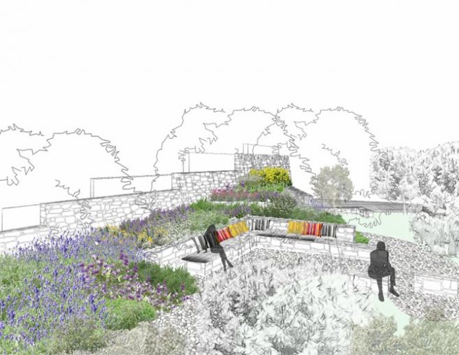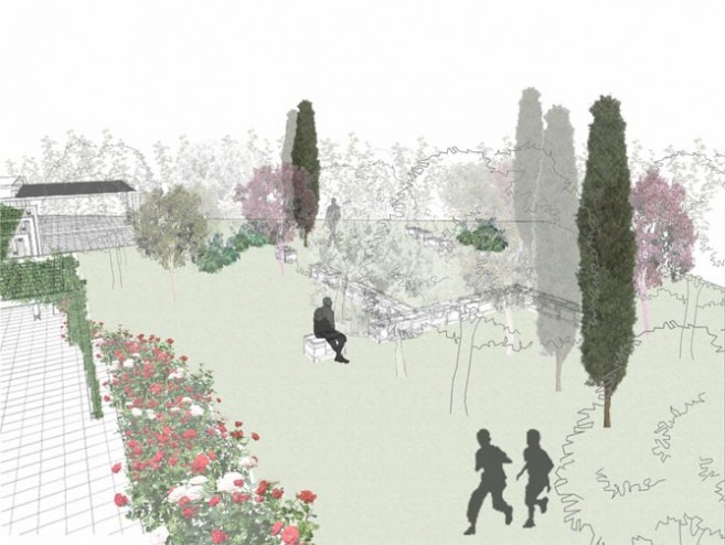Old olive trees and seating areas under the pine trees are surrounded by low aromatic herbs, edible plants and summer fruit trees featuring the Mediterranean zone, whereas a dune planting zone leads to the beach.