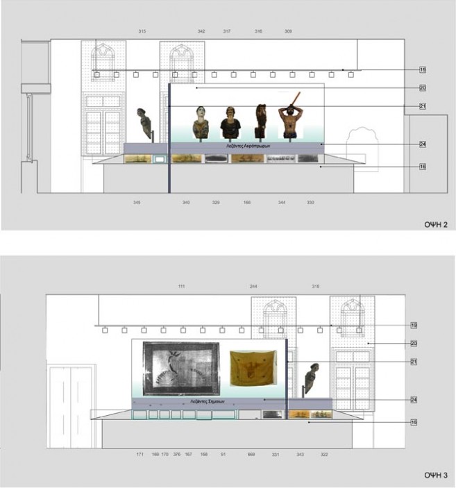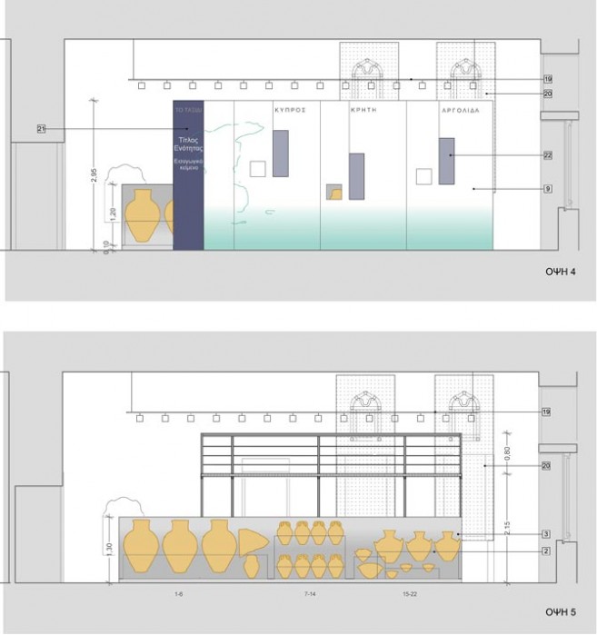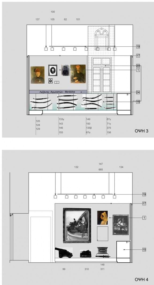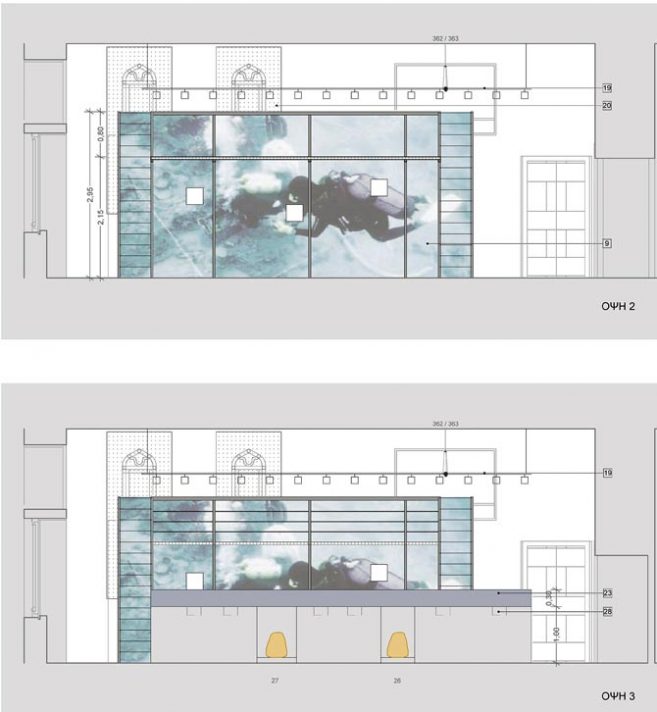The Museum of Spetses is housed in the Hatzigianni Mexi mansion, a striking building dating back to 1798 with noteworthy architectural features. The museological study set as a goal to respect and highlight the nature of the building and to adapt to the existing space layout, creating and integrating conceptual chapters within the boundaries of each hall. The exhibition infrastructure allows the geometry of the spaces to shine through, along with the openings and the unique aspects of the building. The constructs are located at a distance from the shell of the building, in order to underline that they belong to the exhibition layout and not the original building. The display cases all follow a standardized form and design. They are simply and sparely formed in order to meet the requirements of exhibiting a variety of dissimilar material.In the two large symmetrical rooms on the upper level, 9 and 15, the women’s quarters, which open up on 3 sides, the exhibition structure was placed along the centre with longitudinal constructs that follow a similar rationale and leave the space untouched in both rooms, in order to underline their symmetry.Room 9 contains the wreck of Iria and a central construction is created, which divides the space along three different routes / chapters:The path of the ship’s voyage, along with the stops it made, where it loaded merchandise.The shipwreck, a construct with the minimalist form of a ship’s hull, holding the amphorae found on the sea bed. The process and techniques of underwater archaeology.A metal bridge allowing visitors to see the wreck and its amphorae from above, as it was first seen by the divers, who took part in the dig.The construction in room 15 corresponds to that in room 9: A longitudinal central horizontal display case, with an inclined surface containing paintings and documents concerning the struggle for independence. Along the centre of the display case, ship’s figureheads arise out of the emptiness, lit from below. The figureheads from the period of the Greek War of Independence are placed in line, facing the visitors, while the “water fairy”, the figurehead that marks the post-revolutionary period, faces the sea.In the room that contains displays of traditional dress, there are vertical display boxes with metal frames and crystal, which turn around their own axis. They are dotted around the room, symbolizing people, who appear to greet visitors to the place and era. There is an audio system, through which the shapes tell their story, an everyday narrative of their times.Three parallel routes / readings exist, that visitors can take through the museum: